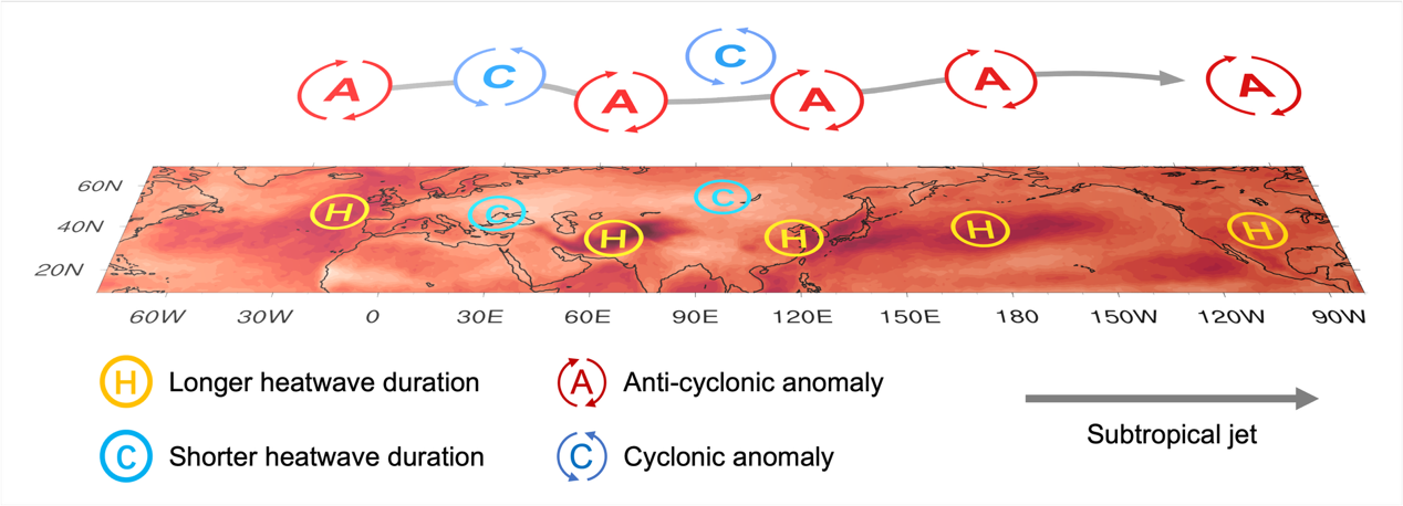 Schematic of CGT and its impact on heatwave. The upper-tropospheric wave train is CGT, and the anti-cyclonic (cyclonic) anomaly can lead to longer (shorter) duration of heatwave. (Image by Yu Hanzhao)